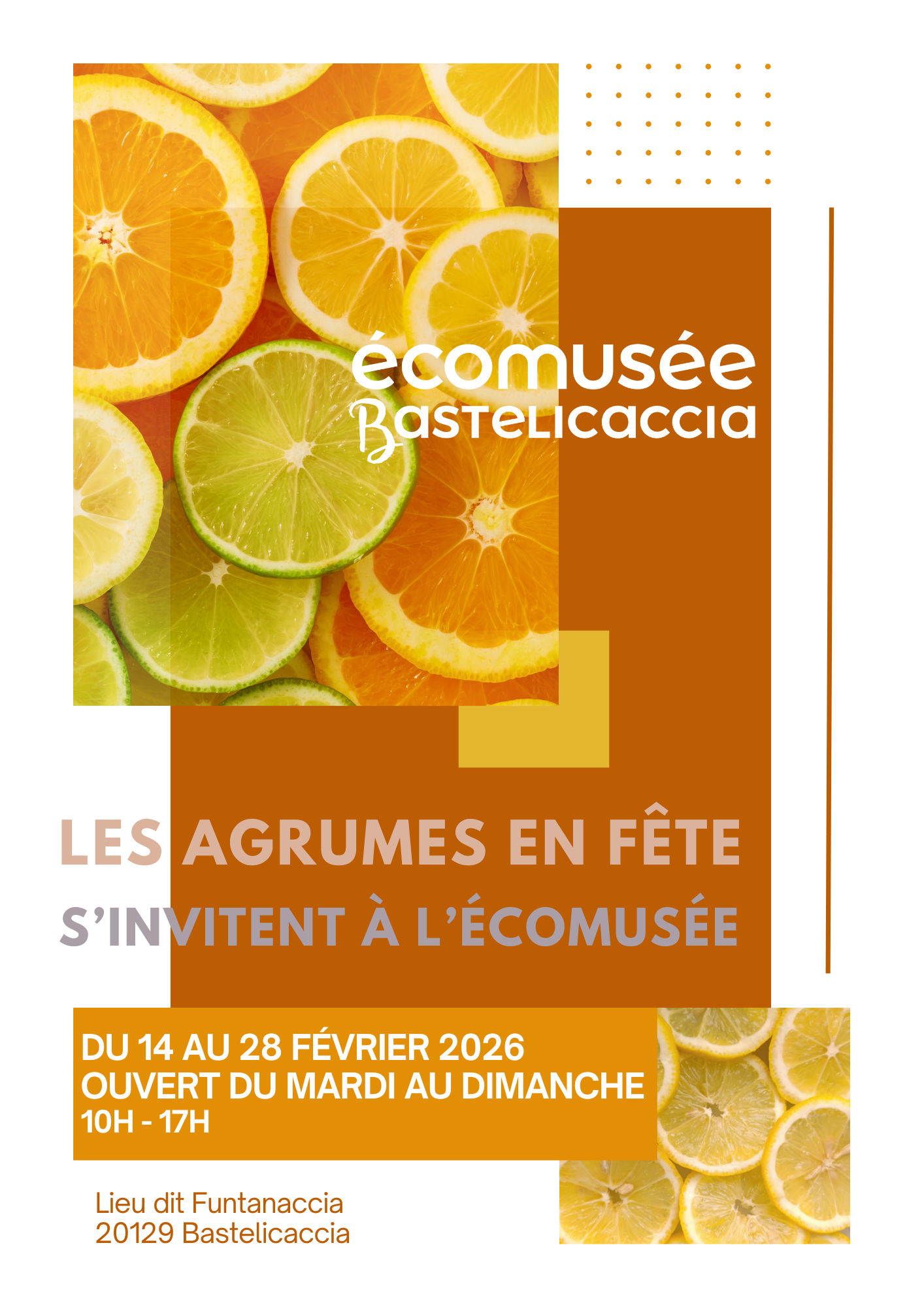 Du 14 au 28 février 2026, la salle d’exposition temporaire met à l’honneur les agrumes. Couleurs et saveurs invitent à la découverte, en résonance avec les savoir-faire de la vallée du Prunelli présentés dans les expositions permanentes de l’écomusée.
