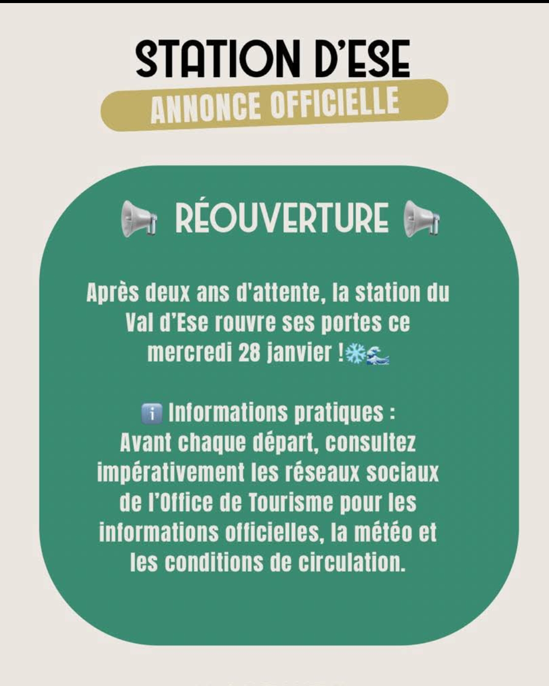 La station de ski du Val d’Ese ré-ouvre le mercredi 28 janvier 2026!