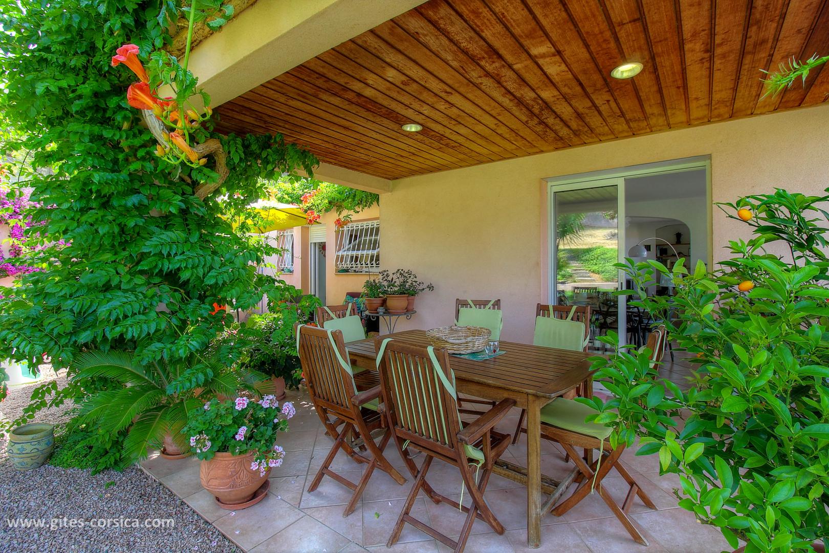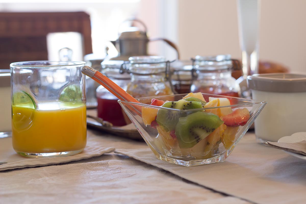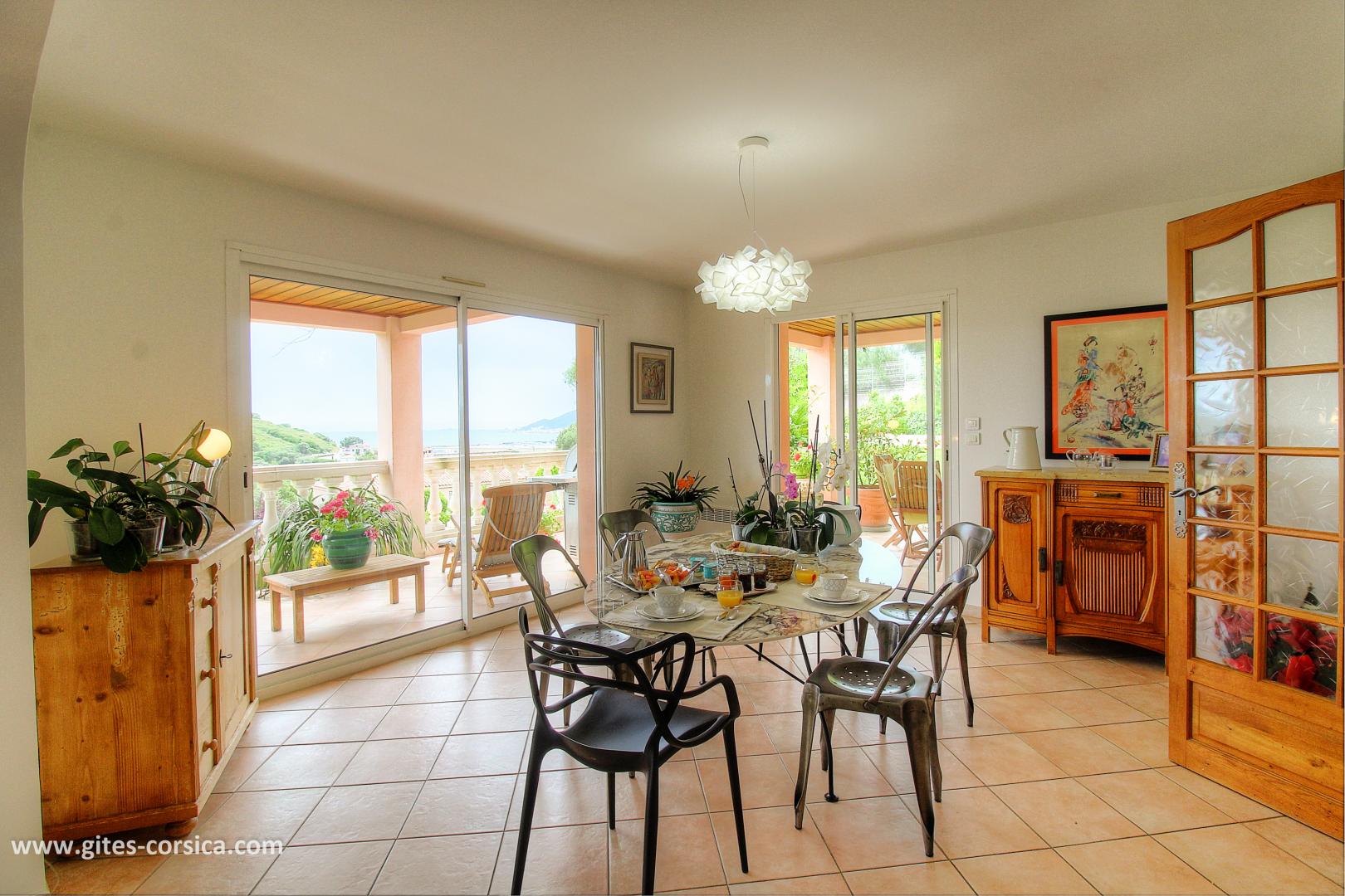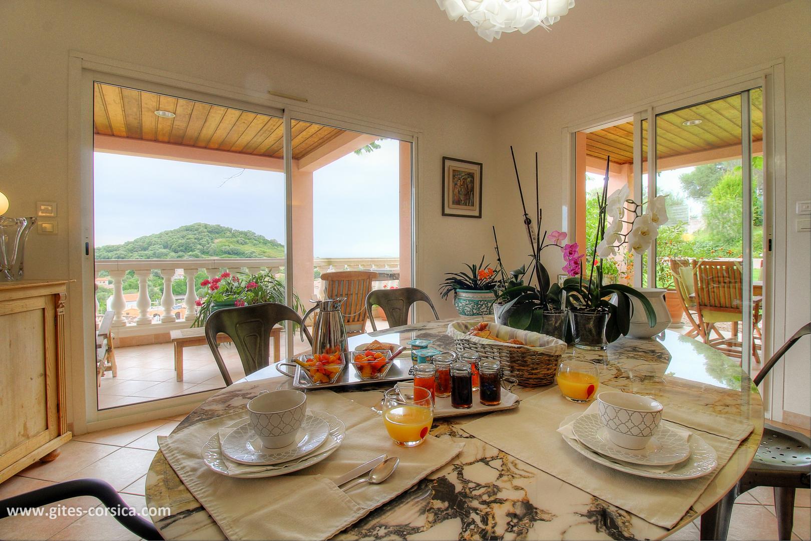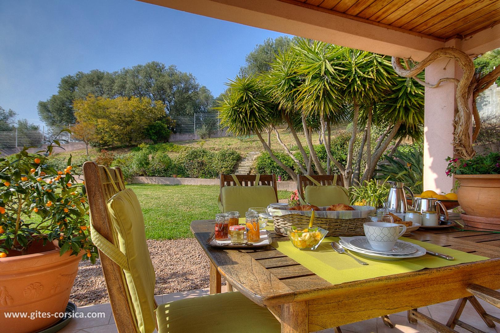 Les petits déjeuners se prennent sur la terrasse commune ou dans la salle à manger selon la météo, ils sont servis entre 8h30 à 10h30. Il est composé de boissons chaudes, viennoiserie, jus d’orange, canistrelli, fromage blanc, salade de fruits et de produits faits maison (confiture, gâteau), charcuterie et œuf sur demande.