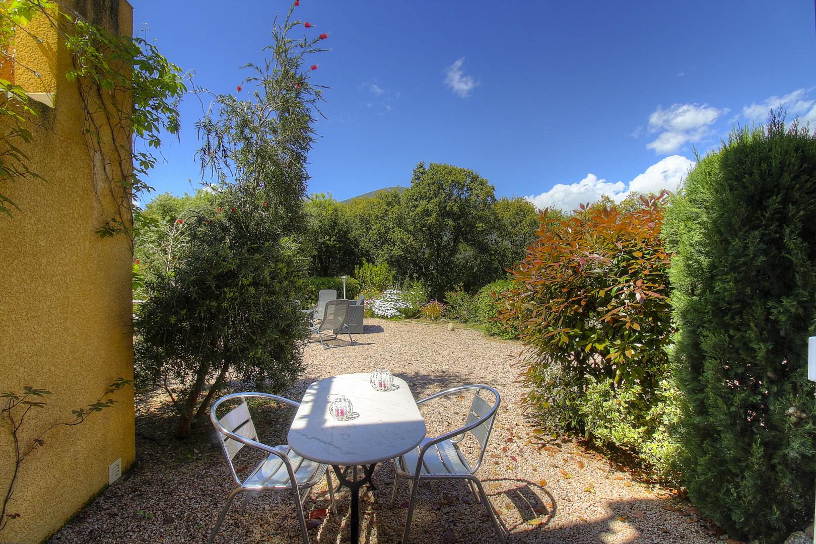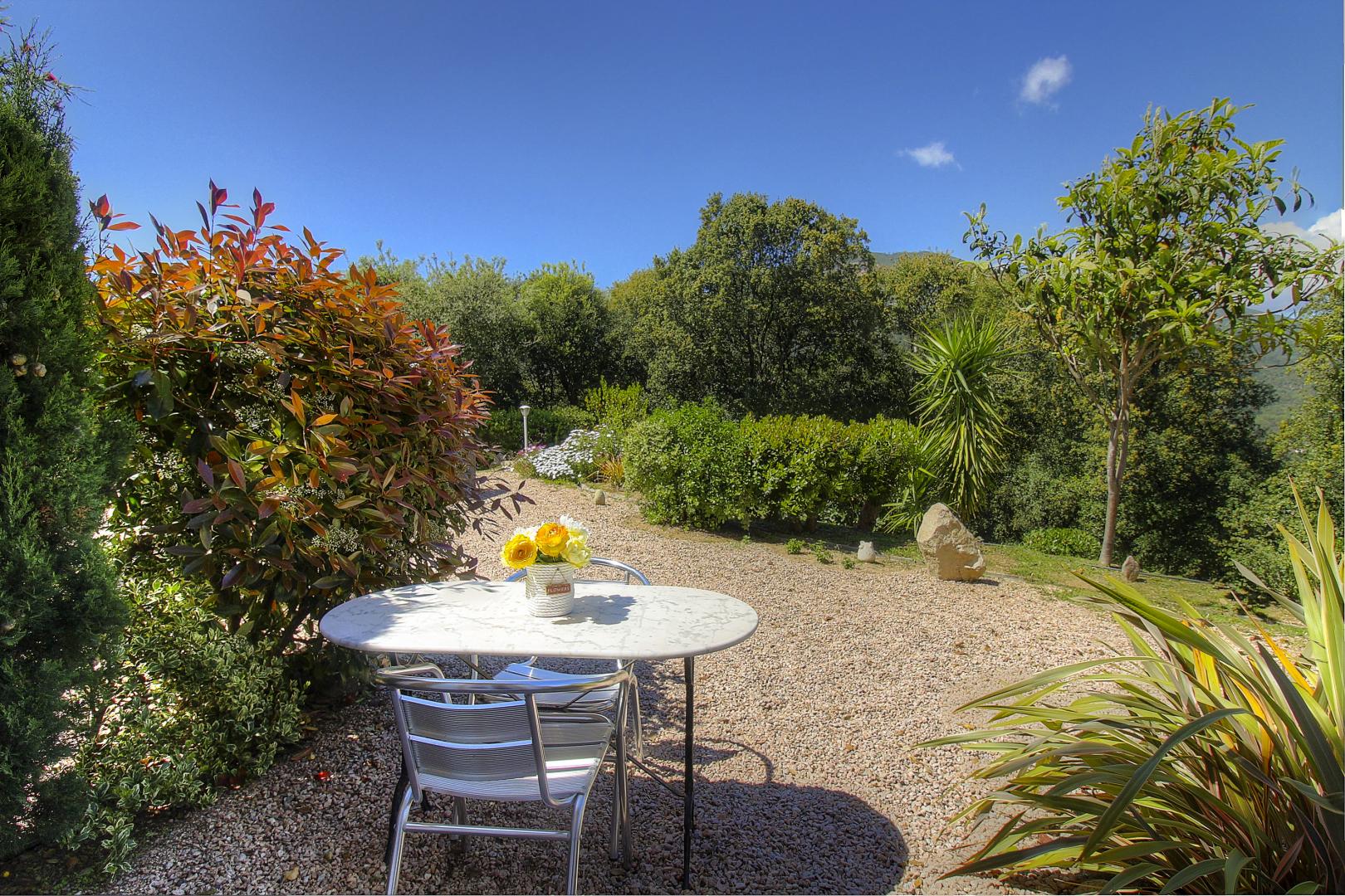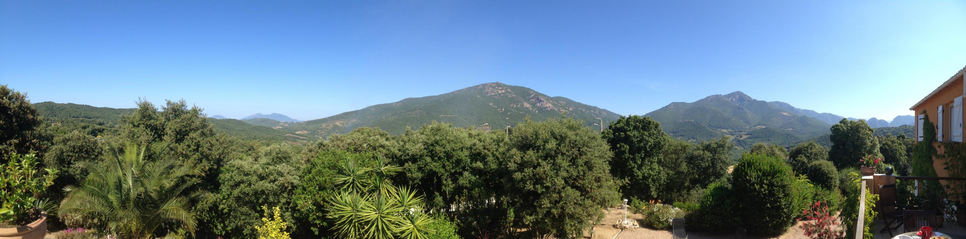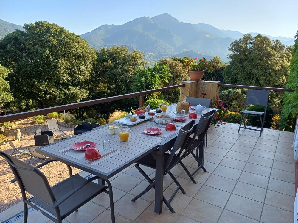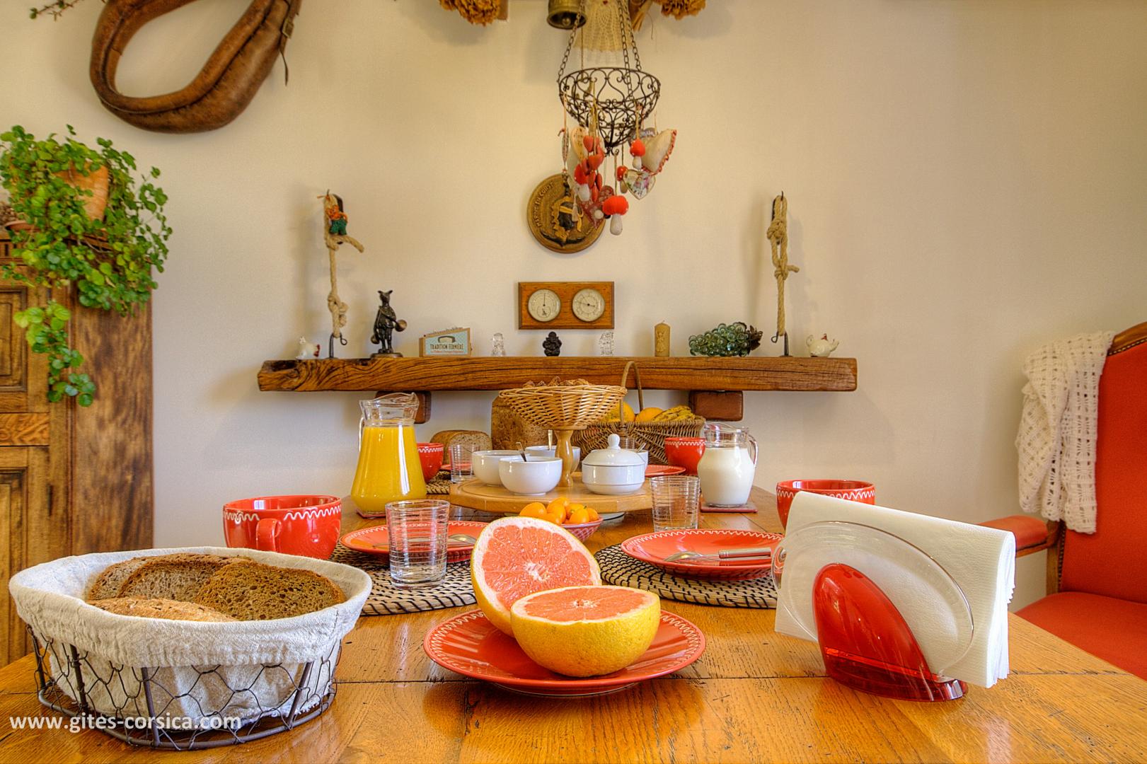 Le petits déjeuners sont servis à l’étage : dans la salle à manger ou sur la terrasse avec vue sur la vallée. Il est composé de viennoiseries, yaourt, pain et confitures maison, canistrelli nature et aux amandes, jus d’orange ou pamplemousse (selon saison)
