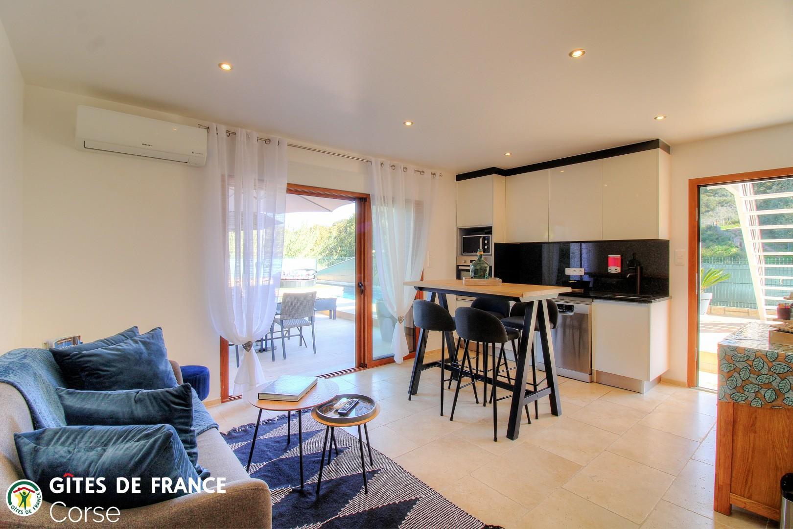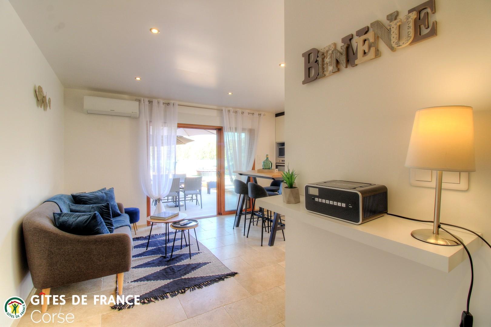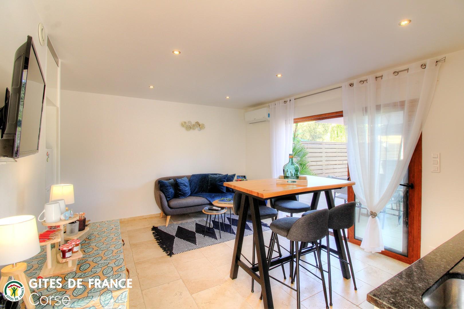 Dans un hameau du village de Bastelicaccia, appartement de 42m² situé au rez-de-chaussée de la maison des propriétaires, comprenant également 2 autres appartements mitoyens (occupés par la famille des propriétaires), il se compose ainsi: