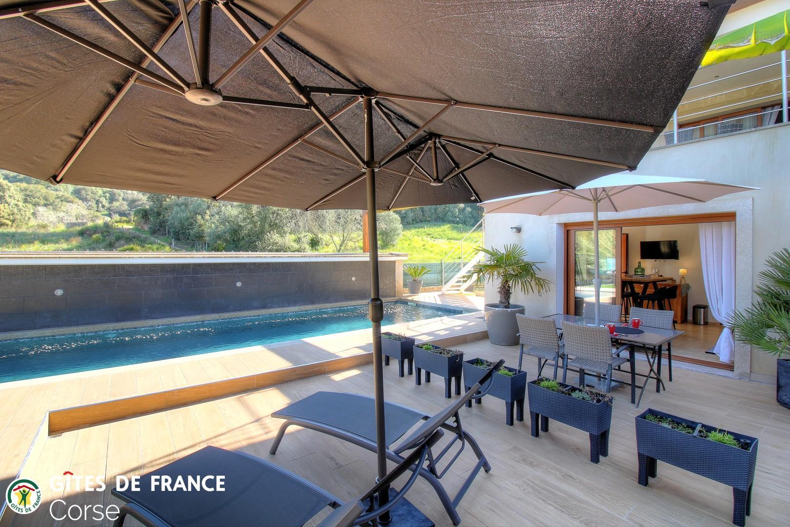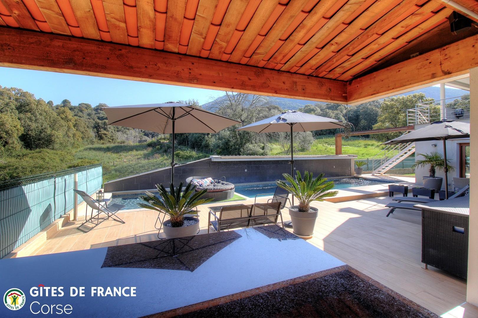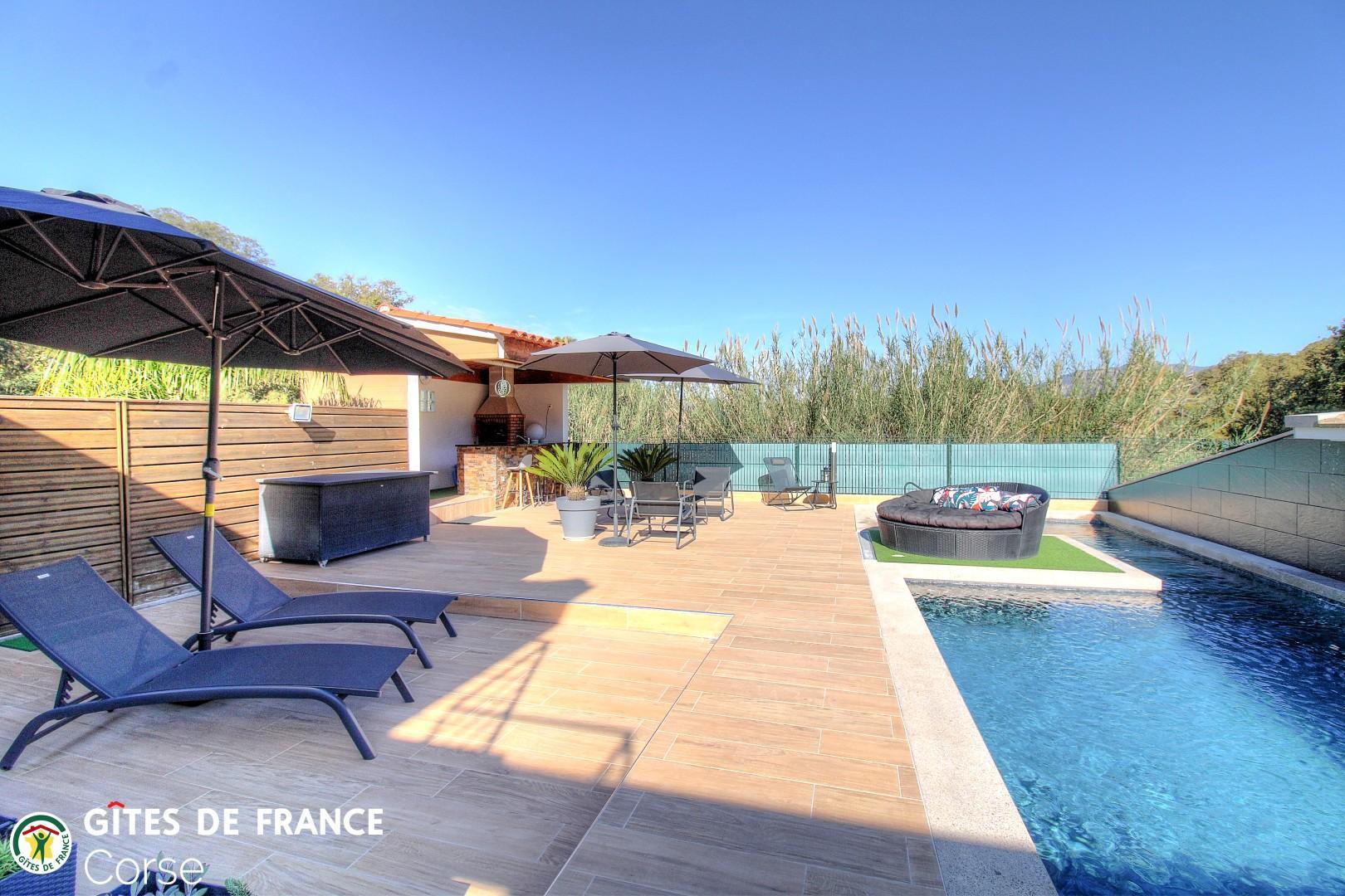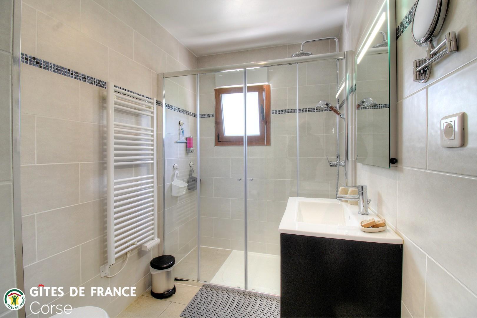 Dans un hameau du village de Bastelicaccia, appartement de 42m² situé au rez-de-chaussée de la maison des propriétaires, comprenant également 2 autres appartements mitoyens (occupés par la famille des propriétaires), il se compose ainsi: