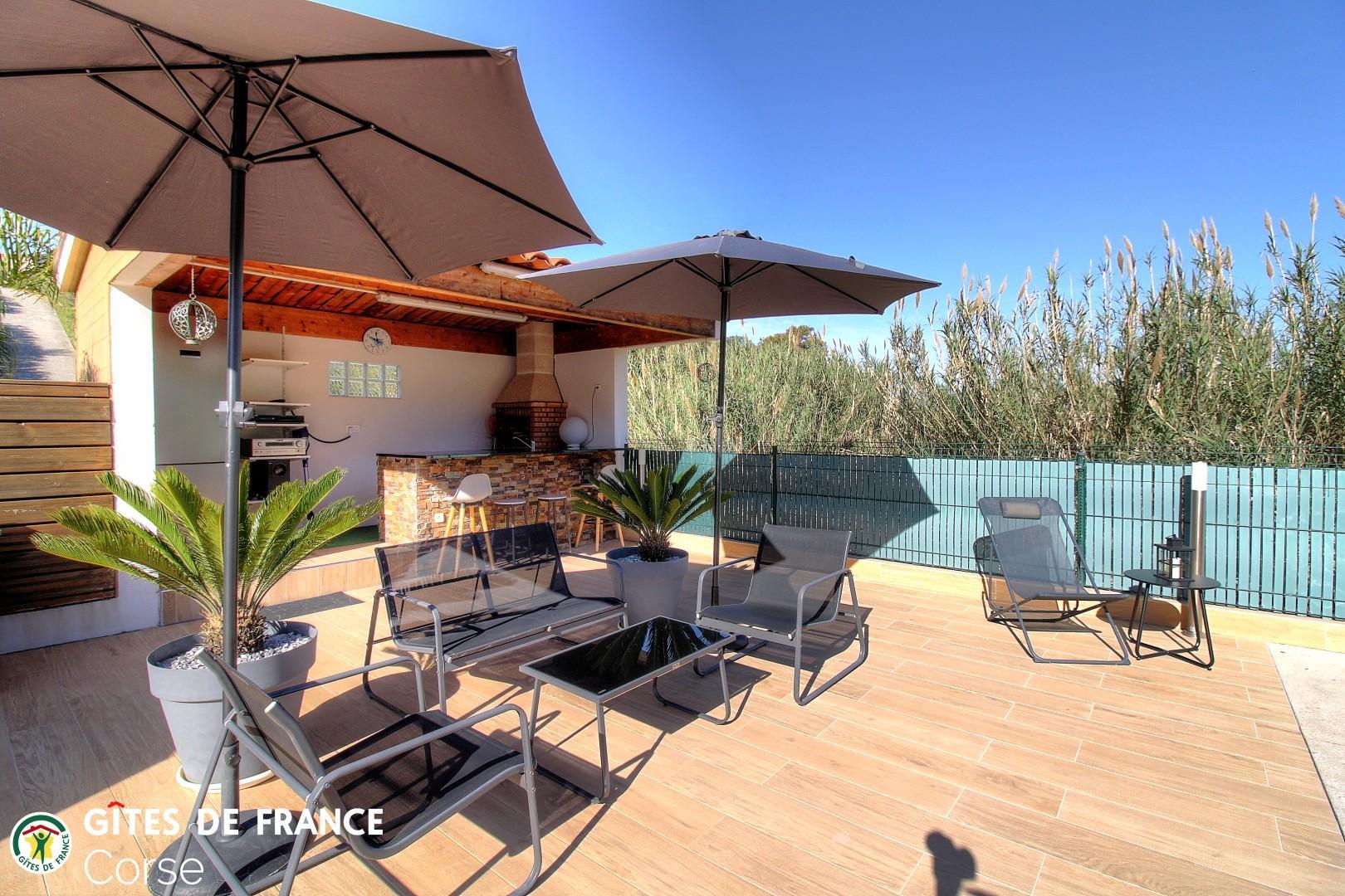 – Terrasse commune avec les autres appartements et les propriétaires, dans le prolongement de la partie privative, accessible de 10h30 à 21h, comprenant un salon de détente et un bain de soleil rond (cuisine d’été non accessible). L’accès à la piscine est autorisé uniquement aux personnes prévues au contrat de location